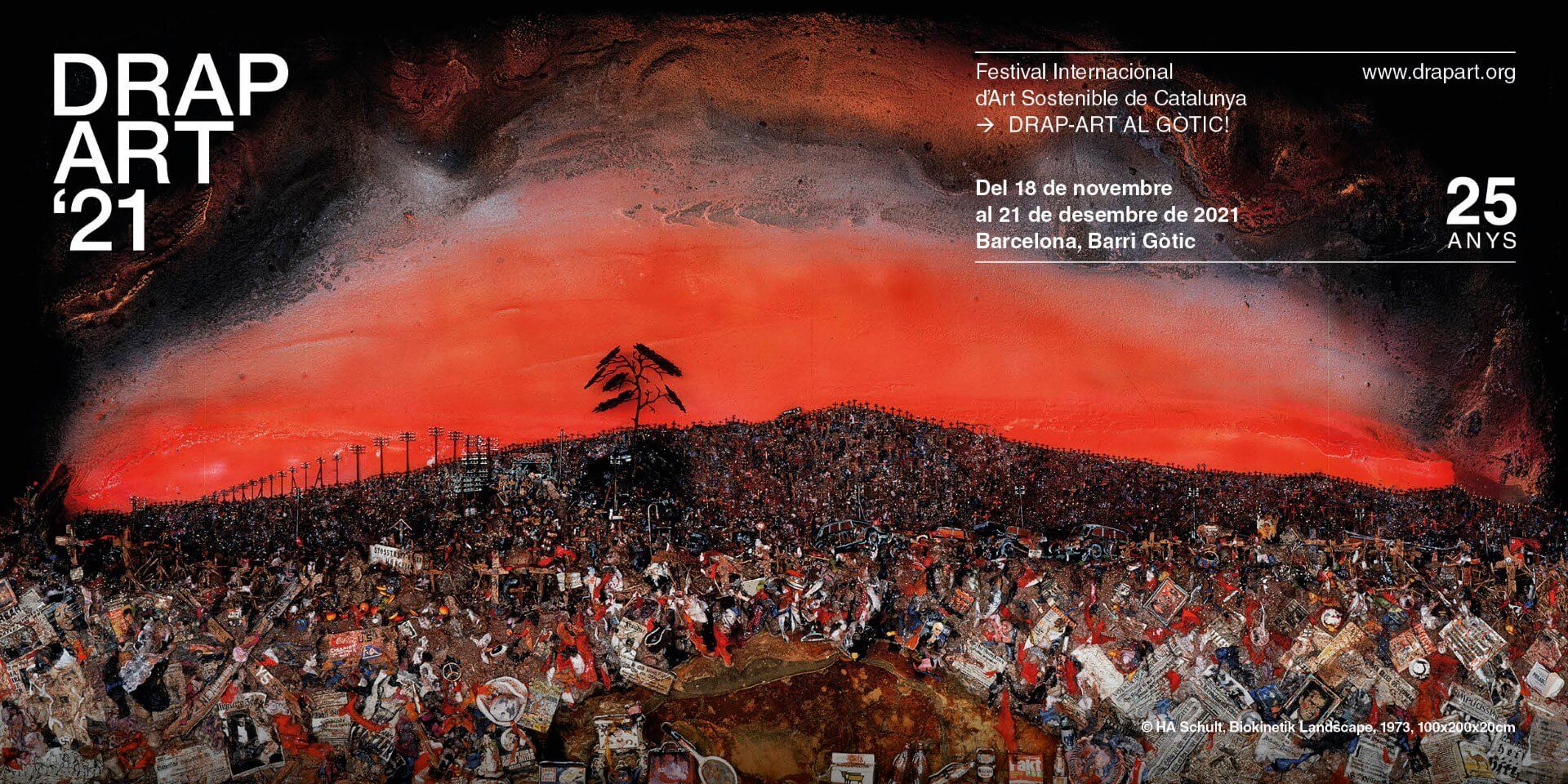 En aquesta edició tan especial del 25è aniversari del Drap-Art, a més de l’habitual convocatòria oberta, Drap-Art inclou dues exposicions comissariades i una exposició de Villa del Arte Galleries. Una d’elles està dedicada a pioners de l’art sostenible com HA Schult i Citadellarte – Fundazione Pistoletto, alguns d’ells ja morts, com Richard Hambleton aka Shadowman (un mestre de l’art urbà del calibre de Basquiat), Bigas Lluna, Rafael Bartolozzi i Lesley Yendell, als quals retem homenatge en la secció In memoriam.