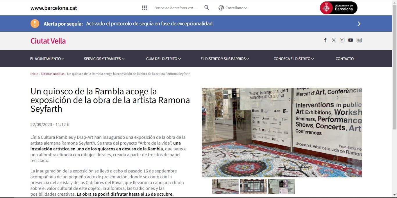 Línia Cultura Rambles y Drap-Art han inaugurado una exposición de la obra de la artista alemana Ramona Seyfarth. Se trata del proyecto “Arbre de la vida”, una instalación artística en uno de los quioscos en desuso de la Rambla, que parece una alfombra efímera con dibujos florales, creada a partir de trocitos de papel reciclado.