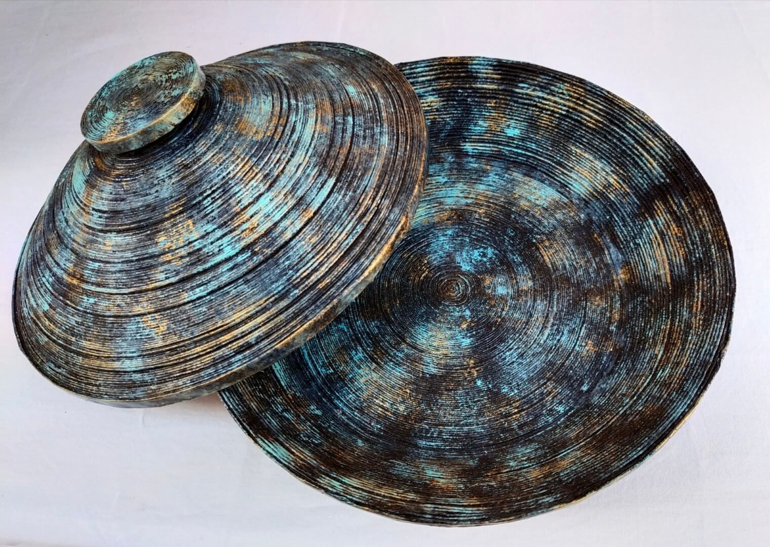 Almau són peces úniques en ferro forjat i vidre fos pintat a mà, utilitzant tècniques ancestrals i reciclant tota la part química del procés,100% lliure de niquel.