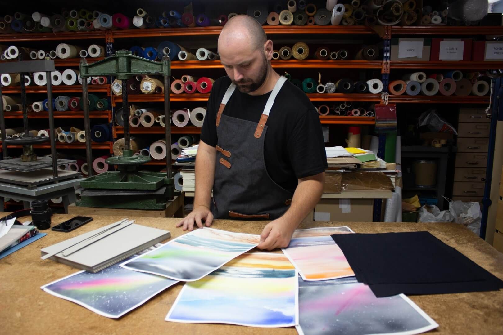 Per fer aquests gravats usa matrius fetes amb envasos de Tetra Brik i tintes a l’aigua, aprofitant materials de rebuig i posant un grà de sorra a la sostenibilitat.